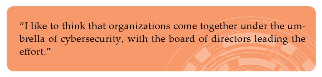I like to think that organizations come together under the umbrella of cybersecurity, with the board of directors leading the effort, combined with multiple organizational components, including business units, HR, Compliance, finance, internal audit, and procurement. Through collaboration with the CISO and his or her team they can effectively execute the organization’s cybersecurity strategy – cybersecurity does not flourish in a vacuum. For this collaboration to happen, it must start at the top with the executive team. This team must demonstrate, through its actions, that cybersecurity is a priority for the business. Some specific actions that a CISO should observe from their board of directors and executive leadership teams that indicate that cybersecurity is a strategic priority are as follows (Foley & Lardner LLP. 2015):